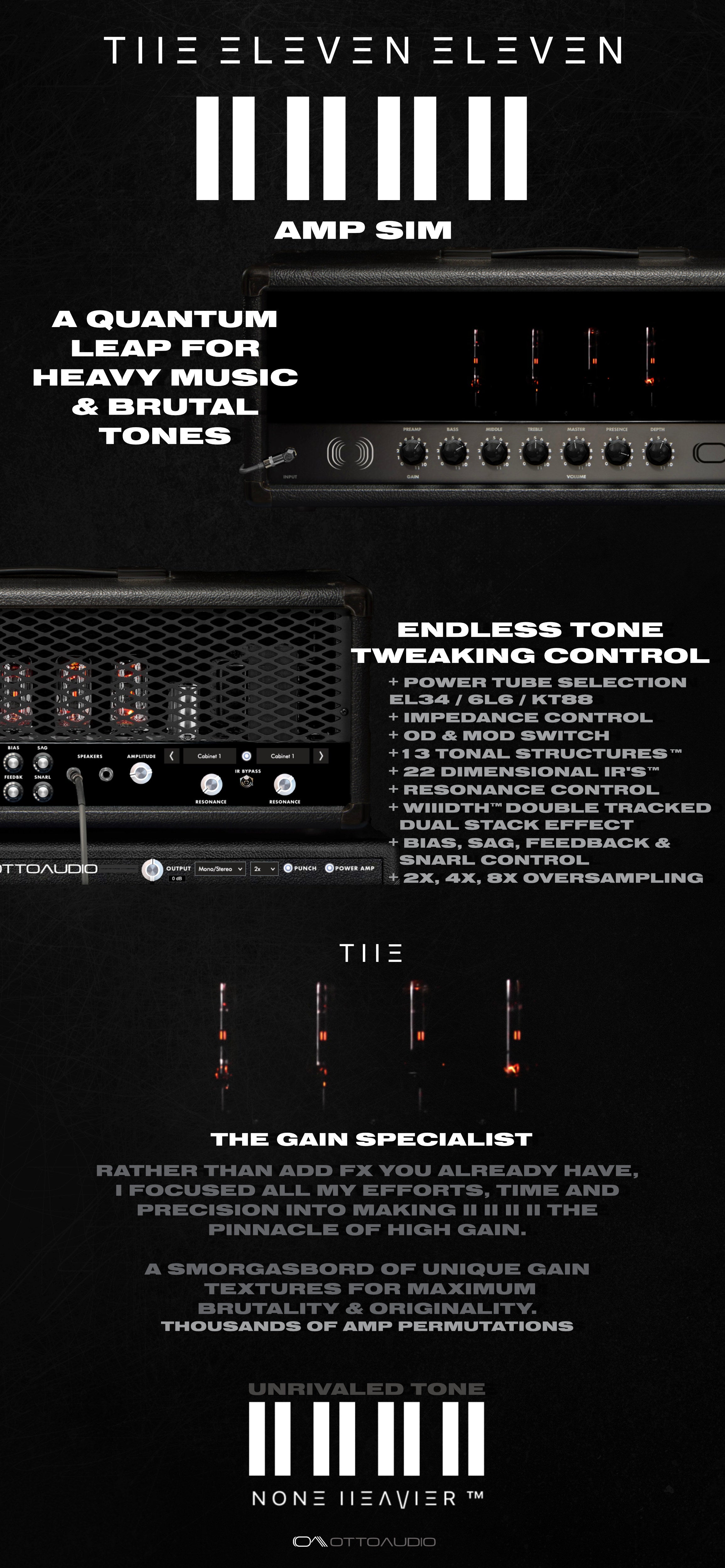 "Having my ears tuned by high end, high gain amps for nearly 15 years, I wanted to be able to sit in front of my studio monitors & reach for a plugin & feel the amp snarl at me the way my stereo rig does when playing through it. While there are some great products out there, all I have been able to get out of amp sims available on the market is the sound of a cab mic'd in another room being re-replicated through my speakers. I wanted to get closer. In a way, transforming my monitors into the speaker cab itself; sitting directly in front of a cranked rig. Born from a relentless pursuit of unique, growling tones and obsession with different distortion characteristics… I wanted something that can inspire, react & saturate like all of these hand wired tube amps I own with oversized transformers. True heavy metal. I have a $20k wall of amps and cabs sitting behind me in my studio, I need a good reason not to turn around and turn them on. II II II II does that at an unparalleled level. This provides truly specific and laser guided precision to the tone obsessed guitarist.. who can fine tune the slightest detail while writing, sessions, or in the process of mixing. Truly a leap forward to escape the box of printed tones. I look forward to hearing what others create. II II II II is the thing."